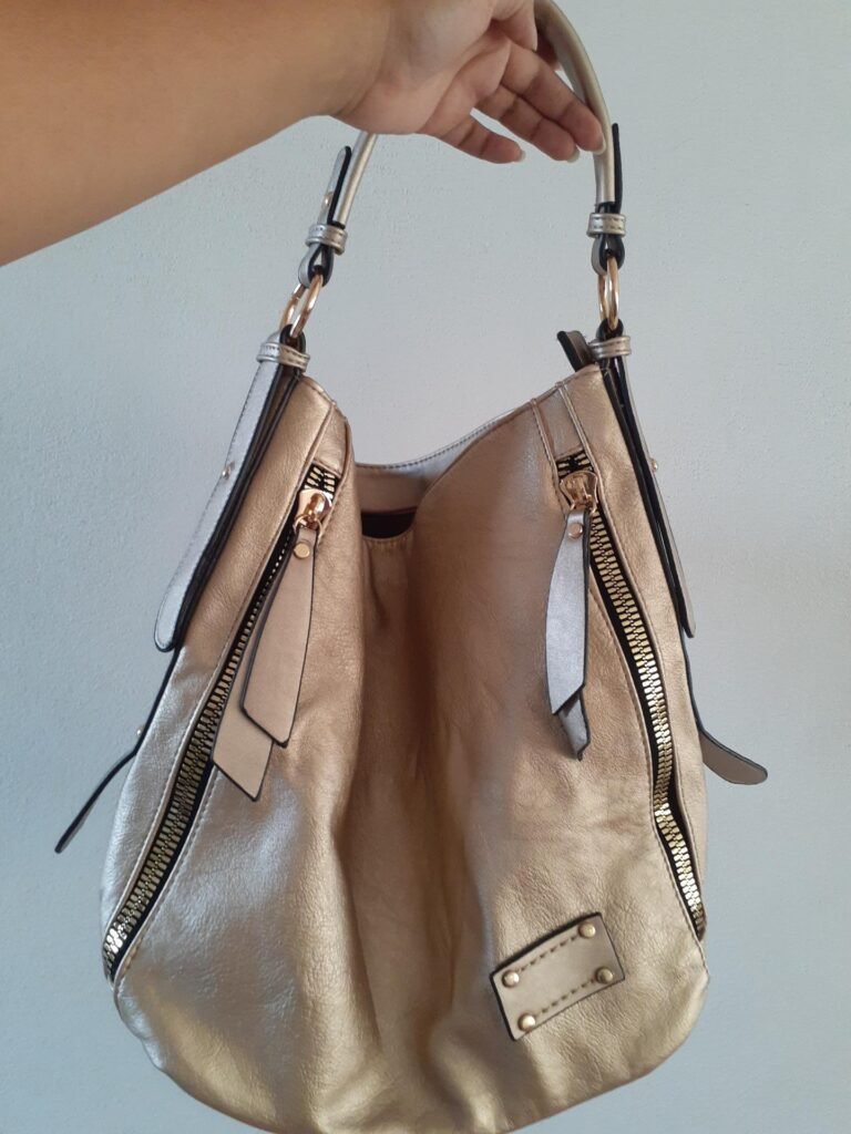 Large hobo bag with shoulder strap, metal hardware and zippers on the sides.