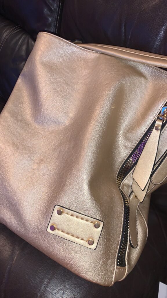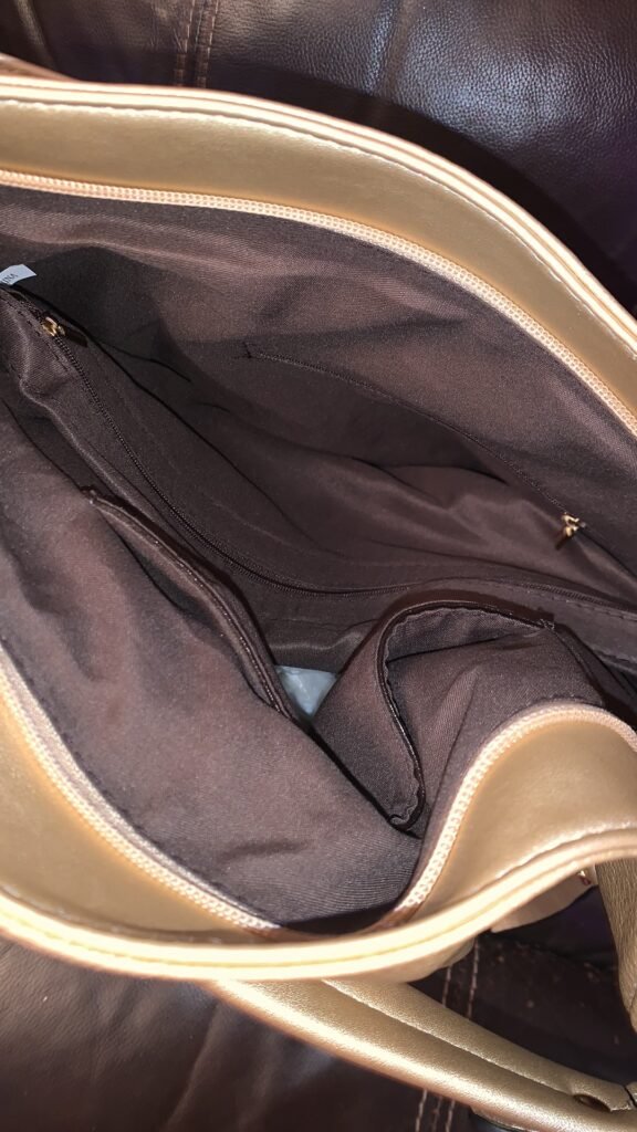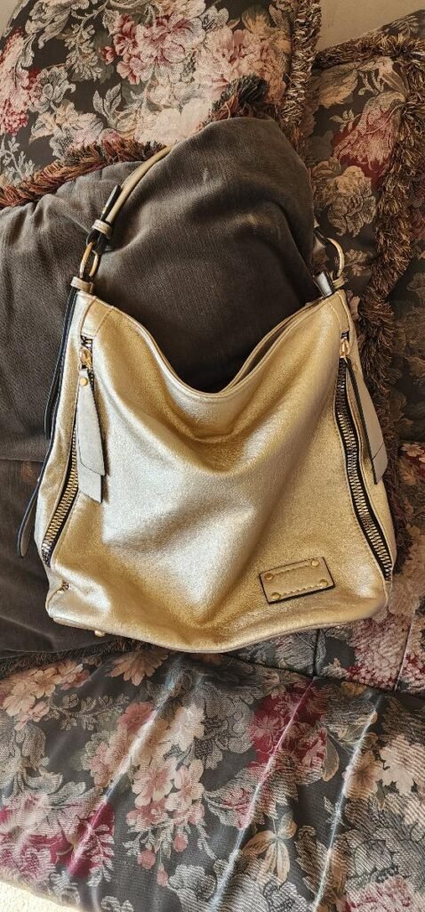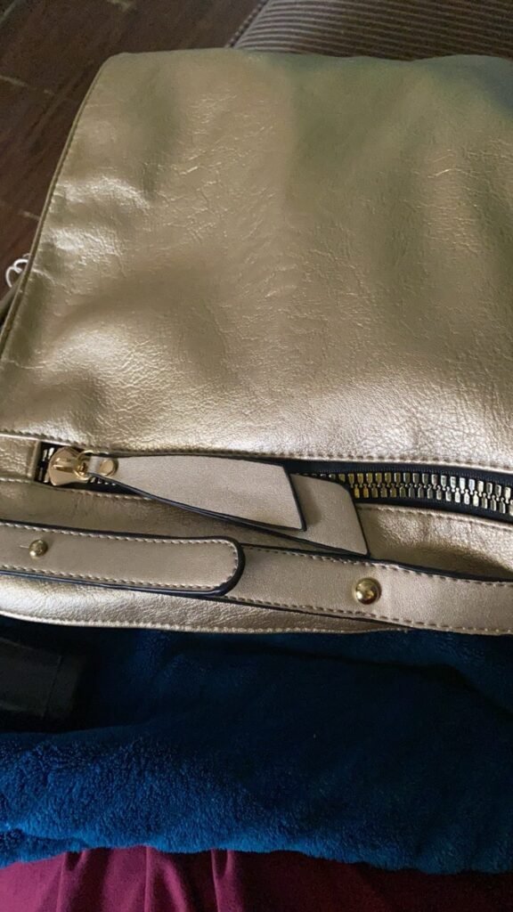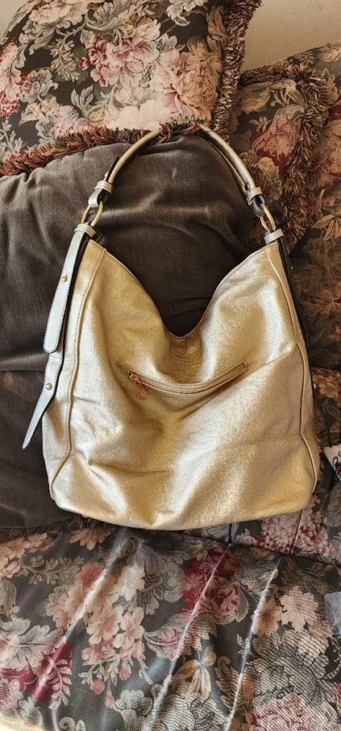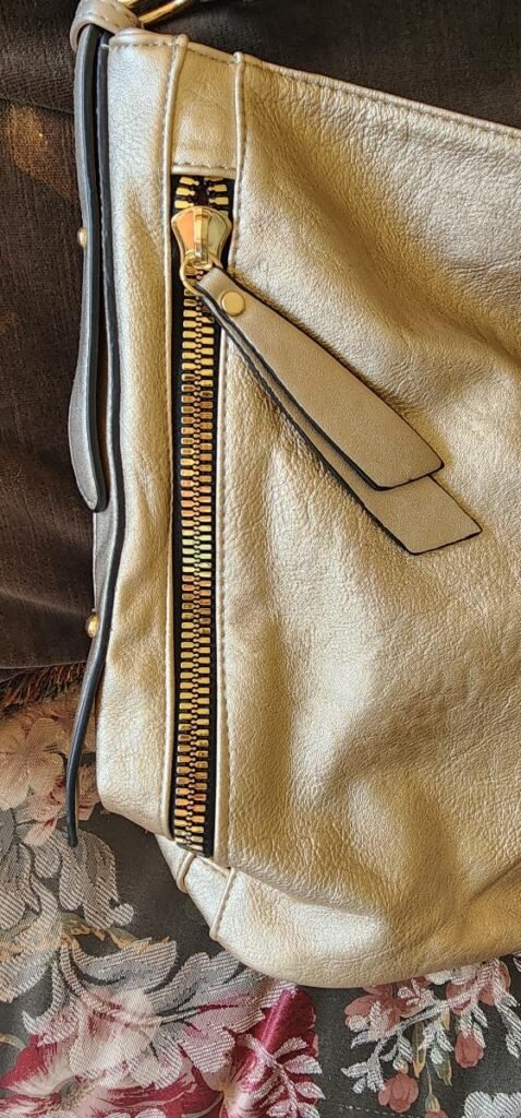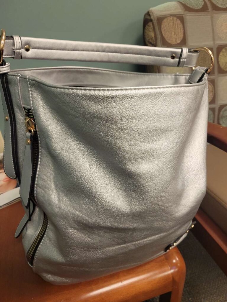 I absolutely LOVE it. It’s larger than I expected, but I really don’t think I looked at measurements. I love the zipper details, and the soft metallic gold which looks like a great faux Pebble grain leather. it’s nice and roomy inside with Zipper pockets and slip pockets, and has a side by side divider which is great so the purse is not a complete bucket. includes a long detached strap. even faux leather purses can be expensive nowadays. this one is worth the price. I’m so pleased, I may get the silver, too. I highly recommend this handbag! ??